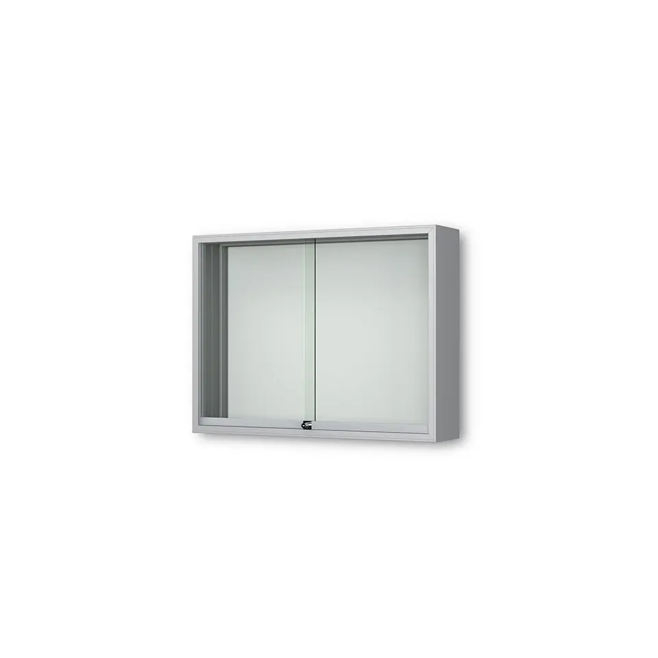 Schaukasten Fortis - eckig - mit Schiebetüren - 80 mm Gehäusetiefe, rollengelagerte Schiebetüren, höchster Brandschutz (A1) Größe - 8 × DIN A4 • 930 × 695 mm Öffnung - rollengelagerte SchiebetürenVerglasung - Einscheiben-Sicherheitsglas / ESGOberfläche - Eloxierung in matt-silber (E6/EV1)Beleuchtung - ohne BeleuchtungSchließung - Sicherheitsschlösser mit je 2 SchlüsselnRückwand - weiße, magnethaftende Rückwand inkl. 10 Magnete